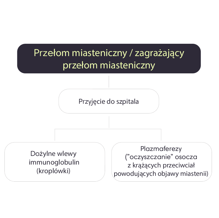 W przypadku wystąpienia zagrażającego przełomu miastenicznego lub przełomu miastenicznego stosuje się tzw. „terapie ratunkowe”. Należą do nich dożylne wlewy immunoglobulin (IVIG) w postaci kroplówek oraz wymiana osocza przy pomocy plazmaferezy (PLEX). Leczenie to odbywa się w szpitalu.